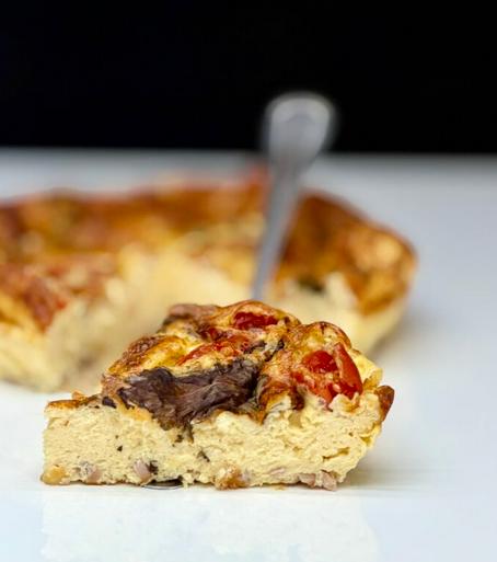 Это не просто омлет или запеканка. Это - вкусный баланс нежности и пикантности, где каждому ингредиенту отведена своя партия. Финальным аккордом выступает свежий базилик, добавляющий свежесть и изысканный аромат.
